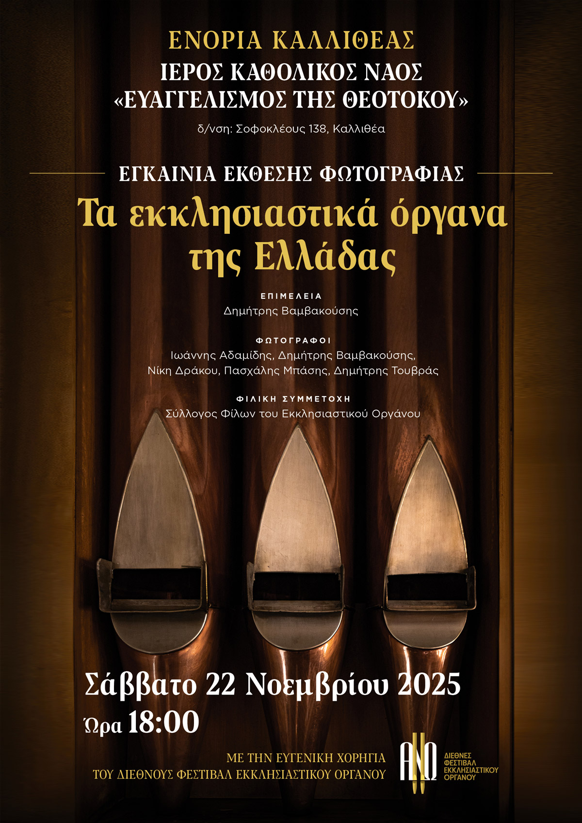 Με πρωτοβουλία της Καθολικής Ενορίας Καλλιθέας, η έκθεση φωτογραφίας «Τα εκκλησιαστικά όργανα της Ελλάδας» που επιμελήθηκε ο Δημήτρης Βαμβακούσης για το Διεθνές Φεστιβάλ Εκκλησιαστικού Οργάνου «ΑΝΩ», ταξιδεύει στην Αθήνα για να παρουσιαστεί: